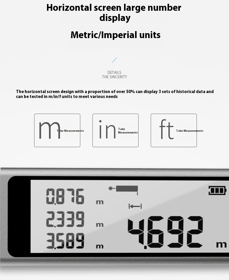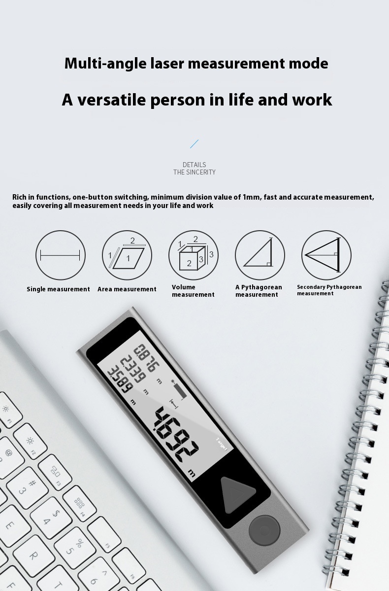 Télémètre bien calibré et précis à 1 mm près. La notice en anglais n’explique pas comment passer d’une mesure “rear” à une mesure “front” . J’ai trouvé la manipulation de manière aléatoire probablement en allumant et éteignant le télémètre plusieurs fois, à moins que cela se fasse automatiquement par contact de la partie arrière sur une surface